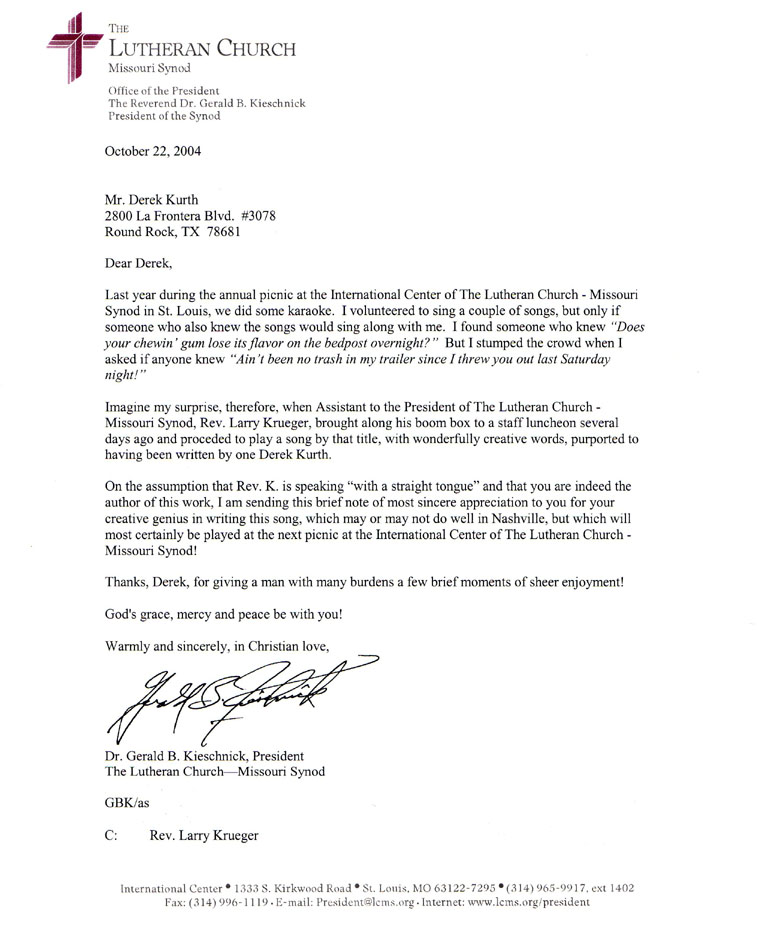 - There Ain't Been No Trash in My Trailer Since I Threw You Out Last Saturday Night. This song's origin is a long story involving the President of the Lutheran Church-Missouri Synod.  Let's just say, President Kieschnick sent me a very nice letter saying he enjoyed the song :-)